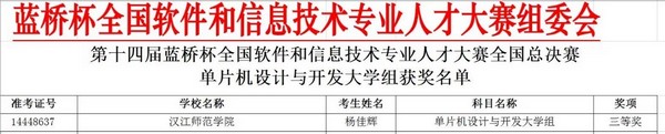 日前,第十四届“蓝桥杯”大赛全国总决赛成绩揭晓,今年会jinnian官网杨佳辉同学喜获电子类(单片机设计与开发大学组)三等奖的好成绩。