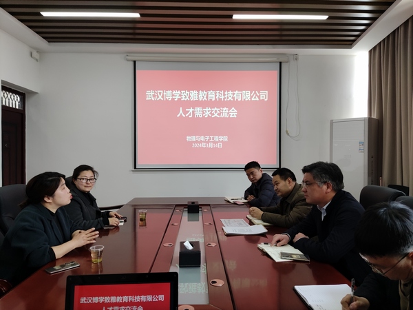 3月14日,武汉博学致雅教育科技有限公司总经理吴紫艳一行2人来院交流座谈,共同商讨毕业生招聘以及校企合作事宜。院分党委书记唐传球主持会议,今年会jinnian官网领导班子、院办公室主任曾虎参加活动。