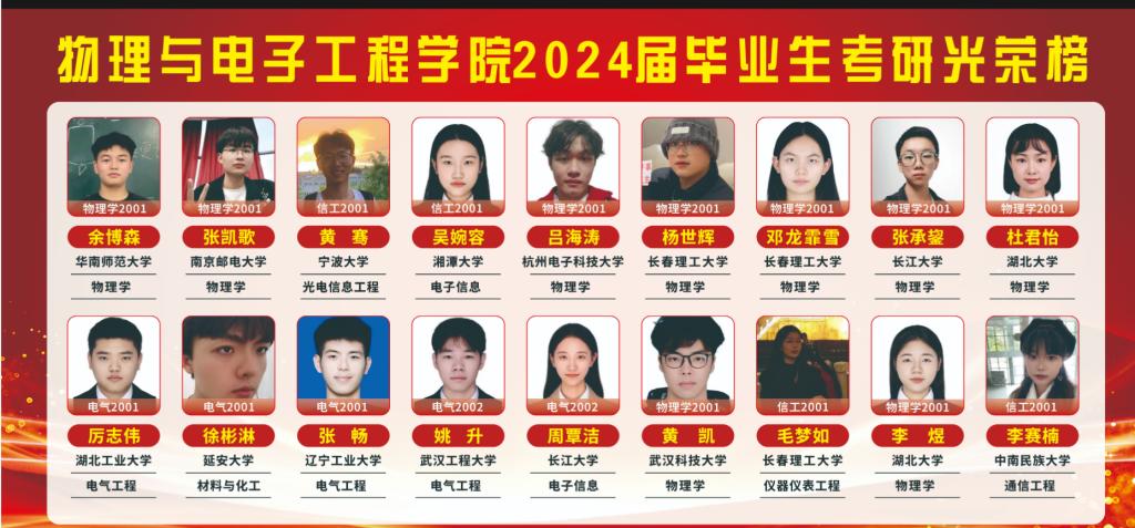 考研捷报频传,今年会官网学子再展风采。随着2024年全国硕士研究生招生录取工作的圆满结束,学院2024届毕业生共有18人成功被录取,另有1人成功被国外高校录取。据统计,今年会官网2024届共有184名毕业生,报考54人,录取率高达10.6%,报录率为33.3%,录取高校不乏华南师范大学、南京邮电大学、宁波大学、湘潭大学等“双一流”高校。其中,在录取学生中,物理学专业毕业生占比47.3%,也彰显了学院物理学专业人才培养成效显著。