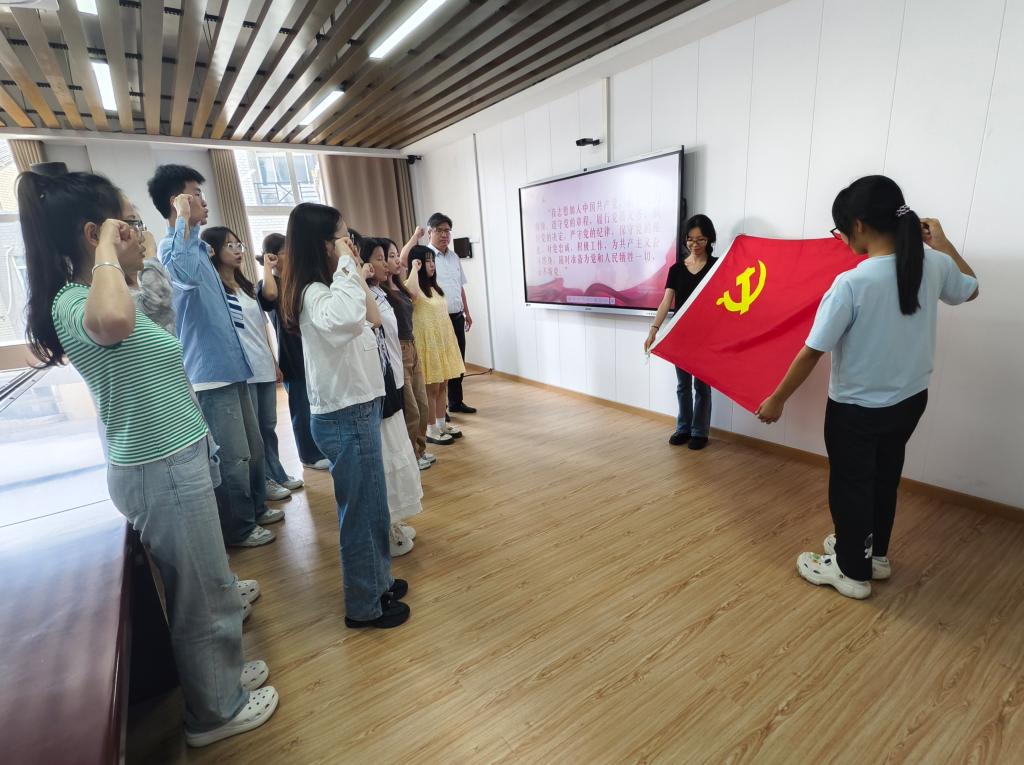 活动伊始,学生党支部组织委员尹诗雅宣读宣读了新发展党员喜报。全体党员在唐传球同志的带领下,面向党旗,高举右拳,庄严宣誓。