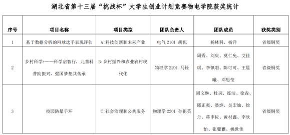 6月18日至6月22日,由共青团湖北省委、湖北省教育厅、湖北省人力资源和社会保障厅、湖北省科学技术协会、湖北省学生联合会共同主办的第十三届“挑战杯”大学生创业计划竞赛获奖名单揭晓。今年会官网《基于数据分析的网球选手表现评估》《乡村科学家—儿童科普助振兴,强国梦想共传承》《校园防暴手环》三个项目获得铜奖。